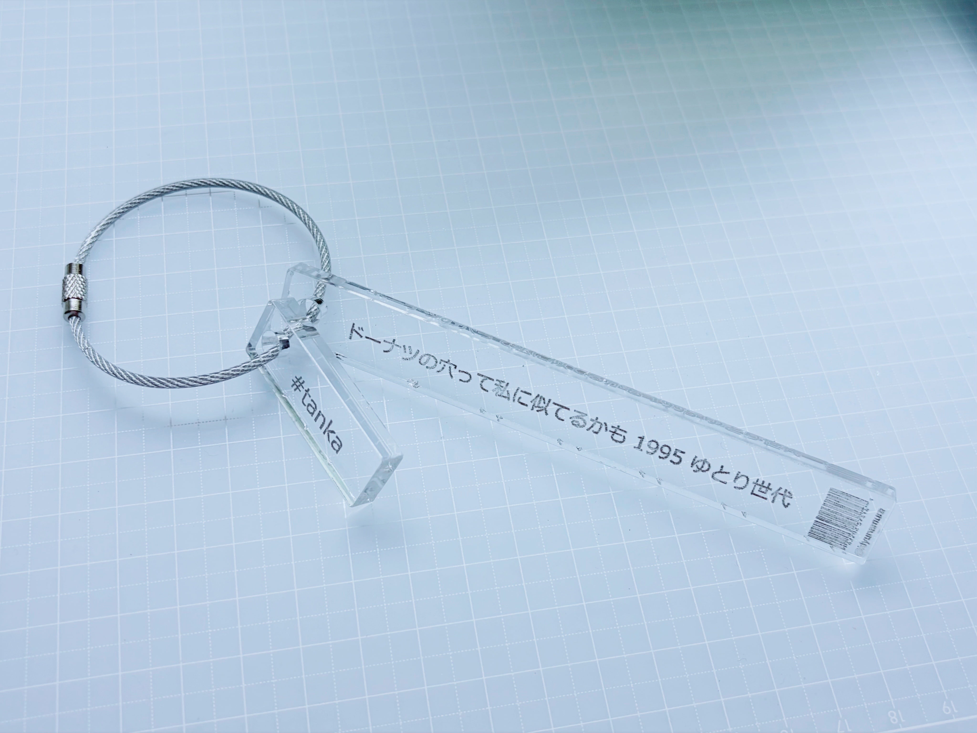 素材:アクリル材、塗料(シルバー)、ワイヤーチェーン 南村が詠んだ短歌のアクキー 分厚めシンプルクリアにシルバーの墨入れです